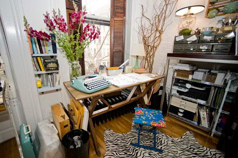 Poppies & Posies是在纽约的一间精品花卉和设计事务的公司,是由Juliet和Sierra在2007年创办的,这里她们的公寓,也是工作室,她们精心的设计的灵感来自于有机运动和著名的花园。Juliet是一个狂热的收藏家,公寓里几乎都是她的收藏品和精美的花卉,其实上,她多数的收藏品都是来自她的祖父母。看到了吗?壁炉的绘画。室内的花卉设计都看得出是非常细心设计的。窗前的,壁炉,台上的……清新而有生机。